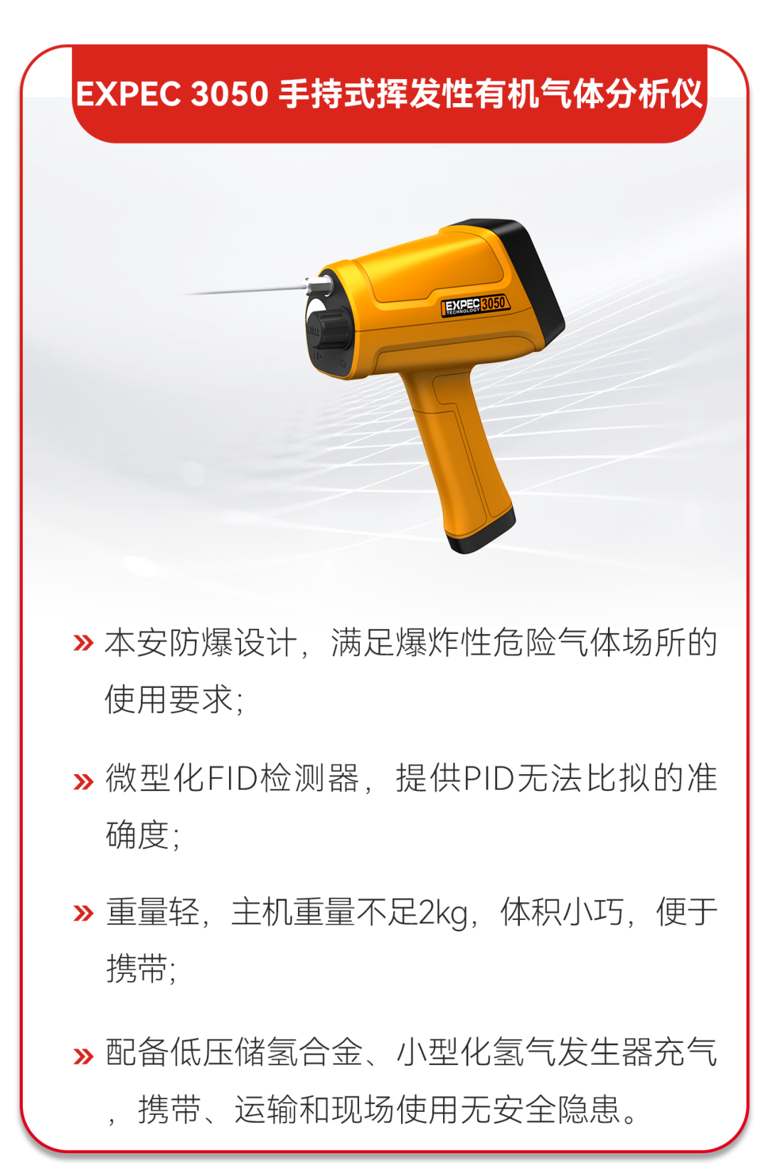 據(jù)譜育科技技術(shù)人員介紹:“EXPEC 3050 手持式揮發(fā)性有機氣體分析儀內(nèi)部搭載FID檢測器,具備‘秒級響應(yīng)’的數(shù)據(jù)分析反饋能力,能幫助督查人員快速進(jìn)行VOCs物料泄漏勘察工作,檢測現(xiàn)場總烴數(shù)值是否存在異常,3-5s的實際響應(yīng)時間便可得到VOCs泄漏氣體的具體濃度數(shù)值。”